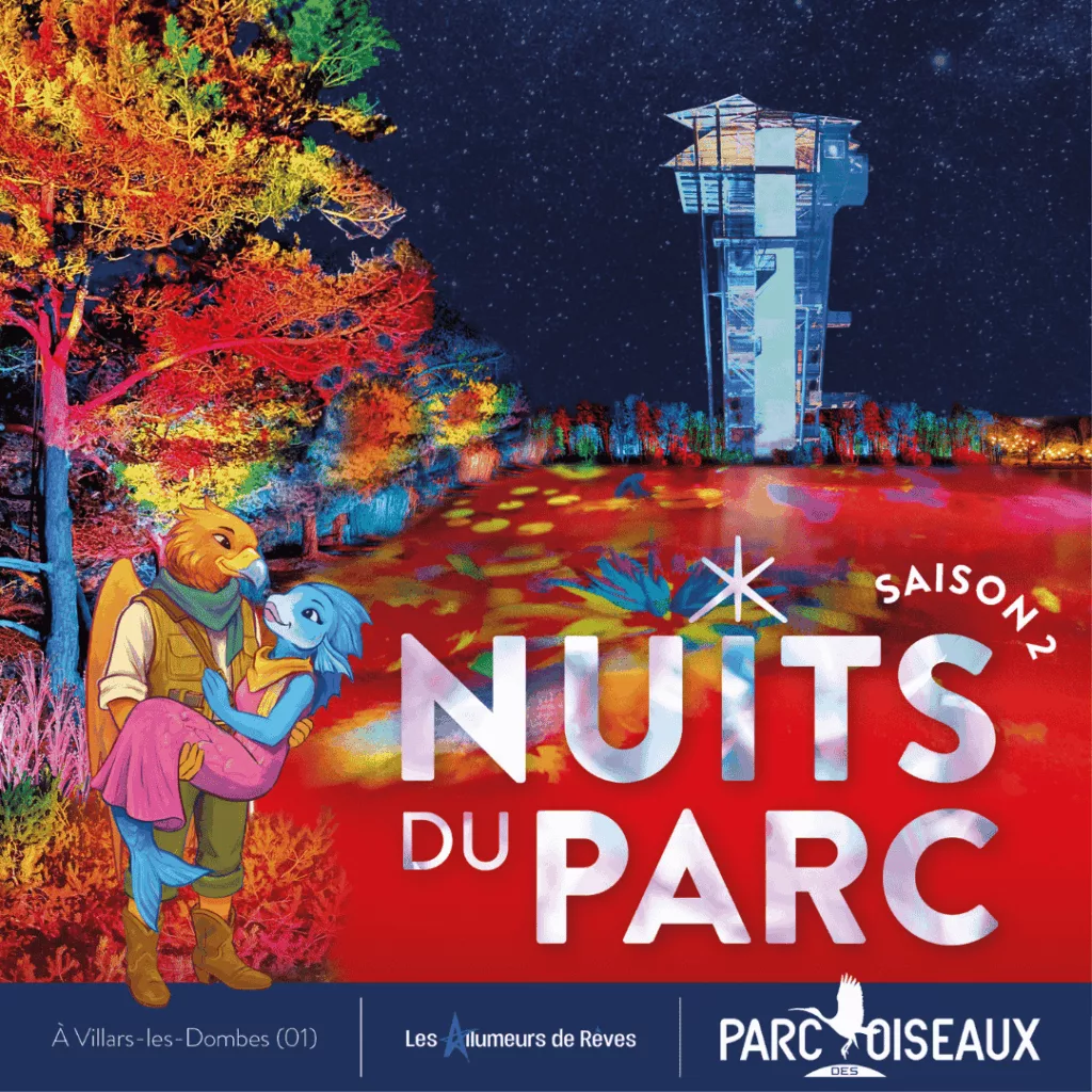 A partir de 18h : Visite d’environ 1h15 des nocturnes du Parc des Oiseaux à Villars-les-Dombes (10 minutes du Cottage). Laissez-vous embarquer par cette mise en scène lumineuse en extérieure qui offrira un spectacle ambulant à toute la famille.